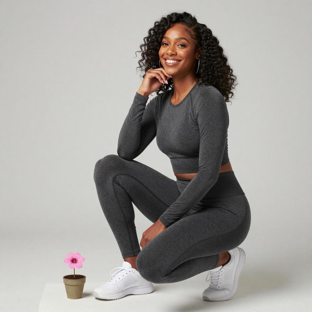 Photograph of a Black woman with long braided hair, wearing a green, long-sleeve, crop top and high-waisted leggings. She leans against a white brick wall with two bright, vertical light panels behind her, creating a stark contrast. Her confident pose highlights her curvy figure and the tight, olive-green outfit.