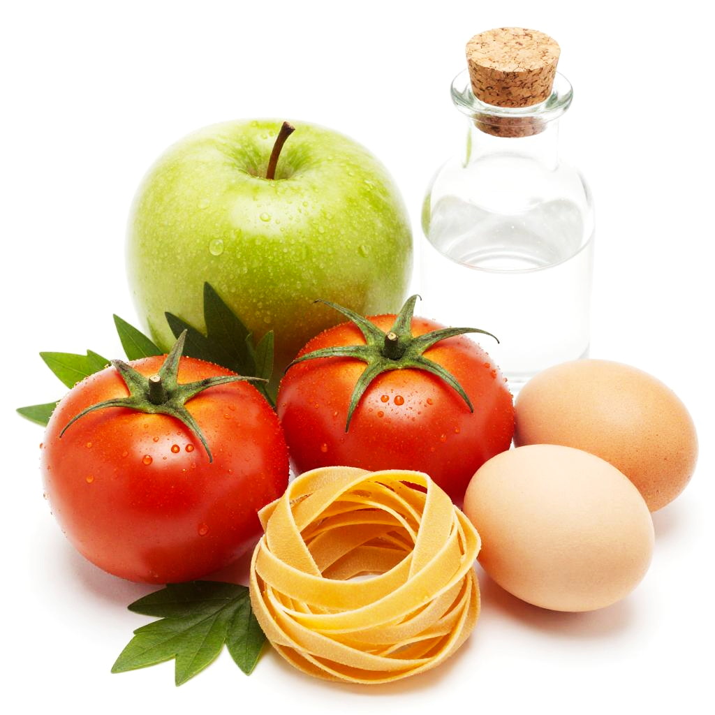 A colorful, bright photograph of fresh ingredients against a white background. In the foreground, there are three vibrant red tomatoes, two yellow pasta nests, and two beige eggs. Behind them, a shiny green apple and a clear glass bottle with a cork stopper are visible. The arrangement is neat, with green leaves peeking out from behind the tomatoes and pasta.