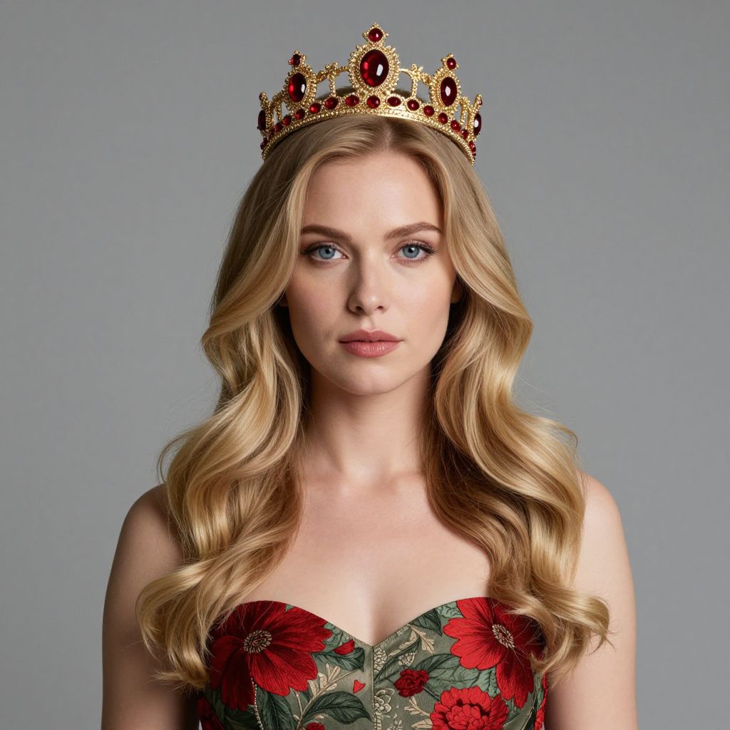 Photograph of a fair-skinned woman with long, wavy blonde hair wearing a gold crown with red gemstones. She has blue eyes and wears a strapless dress adorned with red floral patterns on a green background. The gray background is plain, putting focus on her elegant and regal appearance. Her expression is neutral, and she looks directly at the camera.