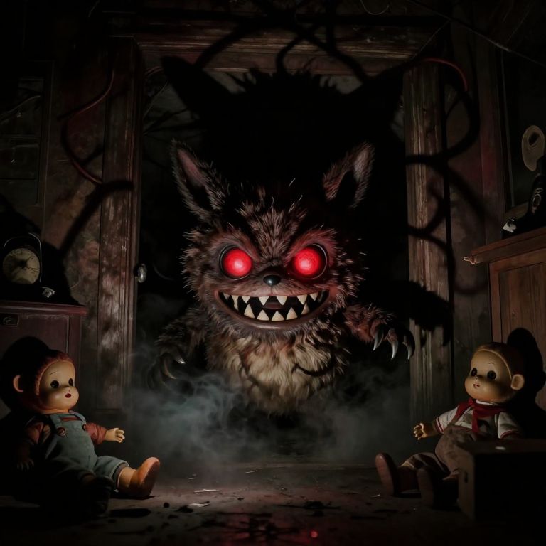 Furby horror movie scene, eerie dimly lit room with twisted shadows, a sinister Furby with glowing red eyes and sharp teeth emerges from the darkness, unsettling atmosphere with fog and old vintage toys scattered around, cinematic horror vibe