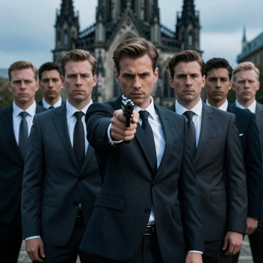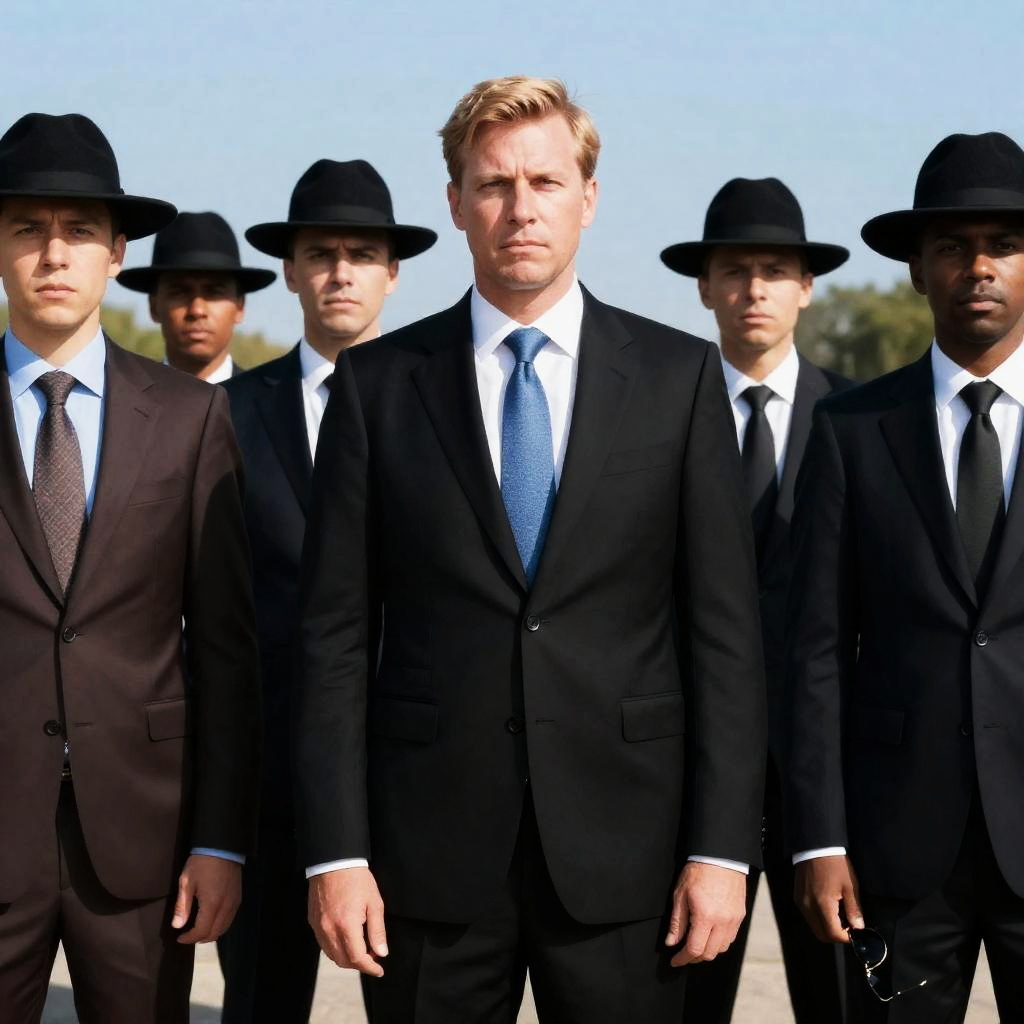 Photograph of six men in formal attire standing outdoors. Central man with blond hair, blue tie, black suit holds a pair of sunglasses. Four men in black hats, dark suits, white shirts, black ties. One man in brown suit, blue shirt, patterned tie. Clear blue sky, trees in background. Central man's expression is serious, others' expressions neutral. Sunlight highlights central man's face.