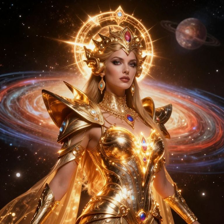 Digital art of a blonde queen in golden, ornate armor with a glowing halo, set against a cosmic background with colorful galaxies. She wears a jew