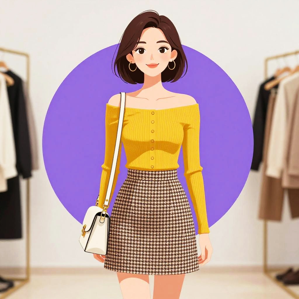 Woman with pretty face and pretty hair. smiling Woman, casual chic, ribbed off-the-shoulder top in mustard yellow, long sleeves, front button details, stretch fit, paired with a high-waisted A-line skirt, houndstooth pattern in brown and cream, mini length, accessorized with a white shoulder bag, white background of a clothing store or studio. --sref 1461