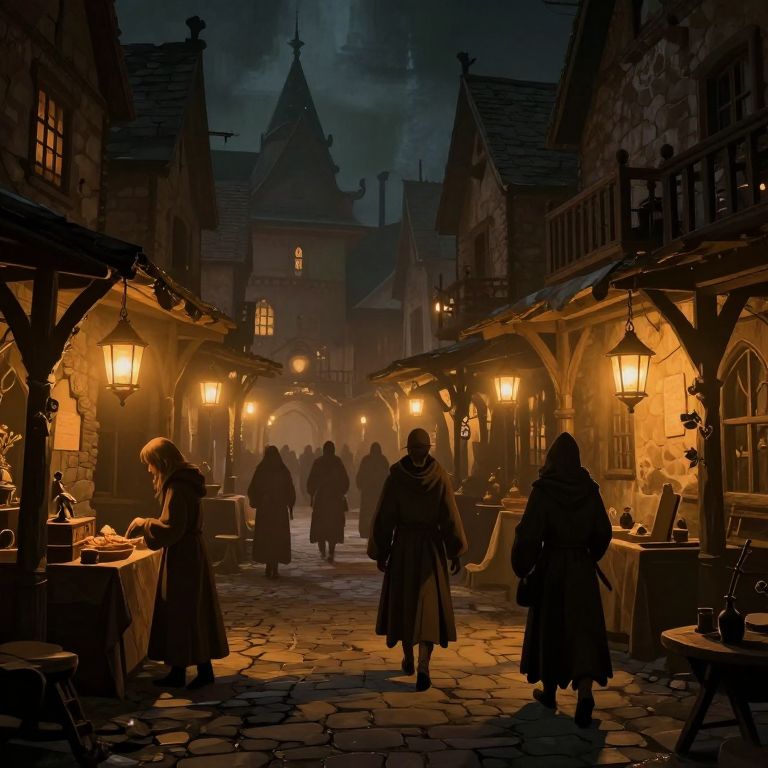 An atmospheric digital illustration depicts a dimly lit medieval marketplace, illuminated by hanging lanterns casting warm, golden light over cobblestone streets, where cloaked figures navigate the shadowy alleys, evoking a mystical ambiance reminiscent of fantasy literature.