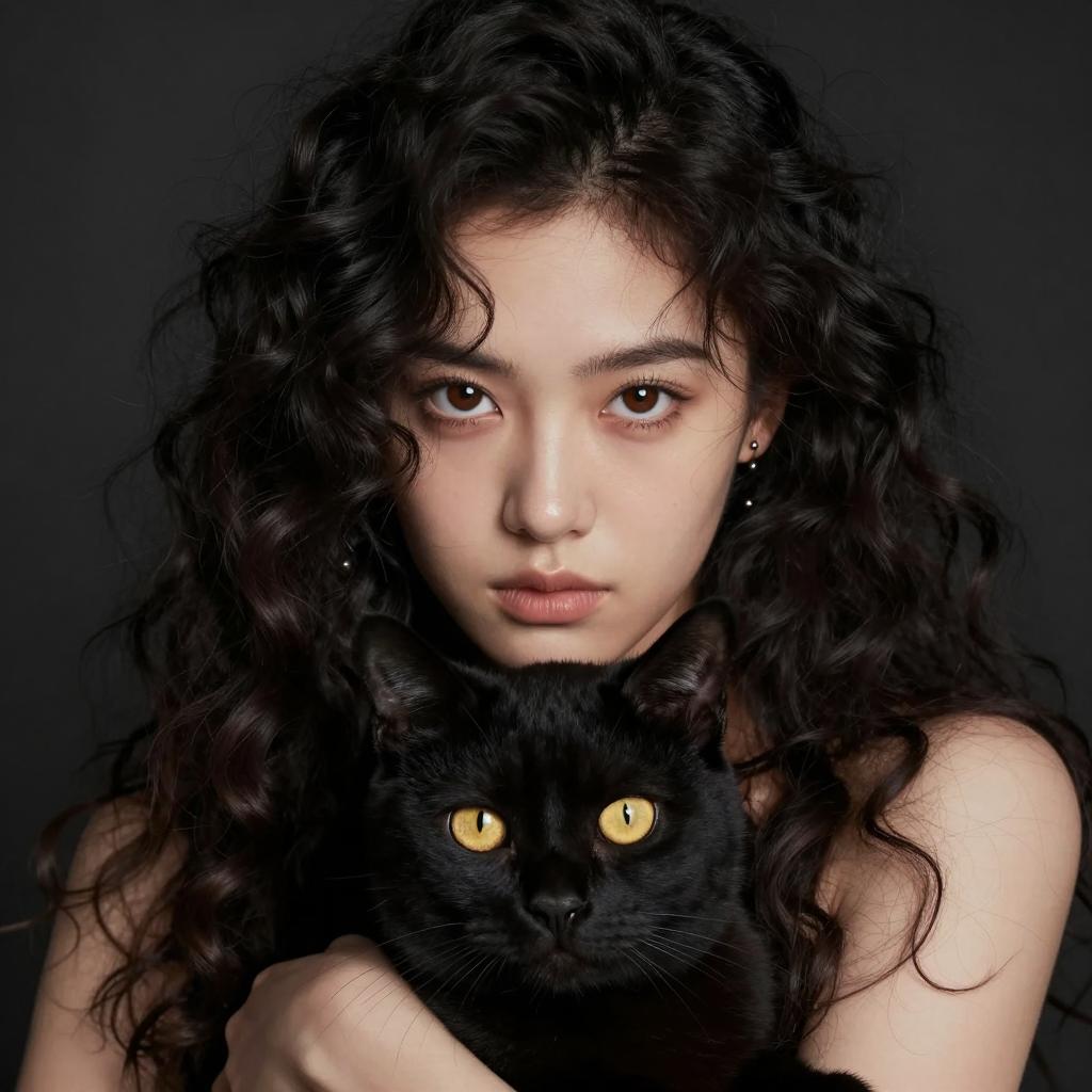 Close-up photo of a woman taking a selfie with a gray cat. Woman has brown hair, light skin, gold ring, and brown eyes, partially covering face with phone. Cat has bright blue eyes, gray fur, and is in the foreground. Woman's lips are near phone screen. Dark background. Woman's right hand holds phone. Cat's ears are pointed up.