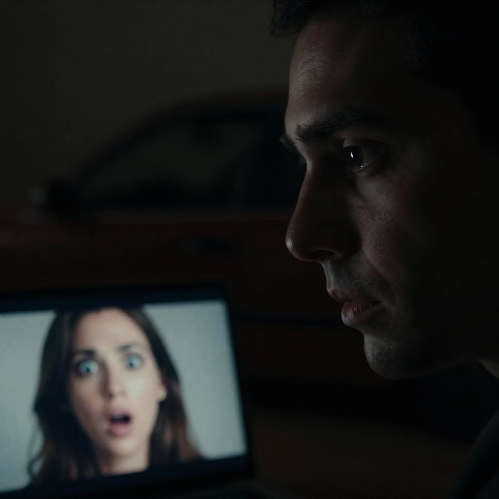 Photograph of a man's intense eye partially illuminated in dark surroundings. A small screen in the lower left shows a shocked woman's face with wide eyes and open mouth. Background includes a dimly lit car. Man's face mostly in shadow.