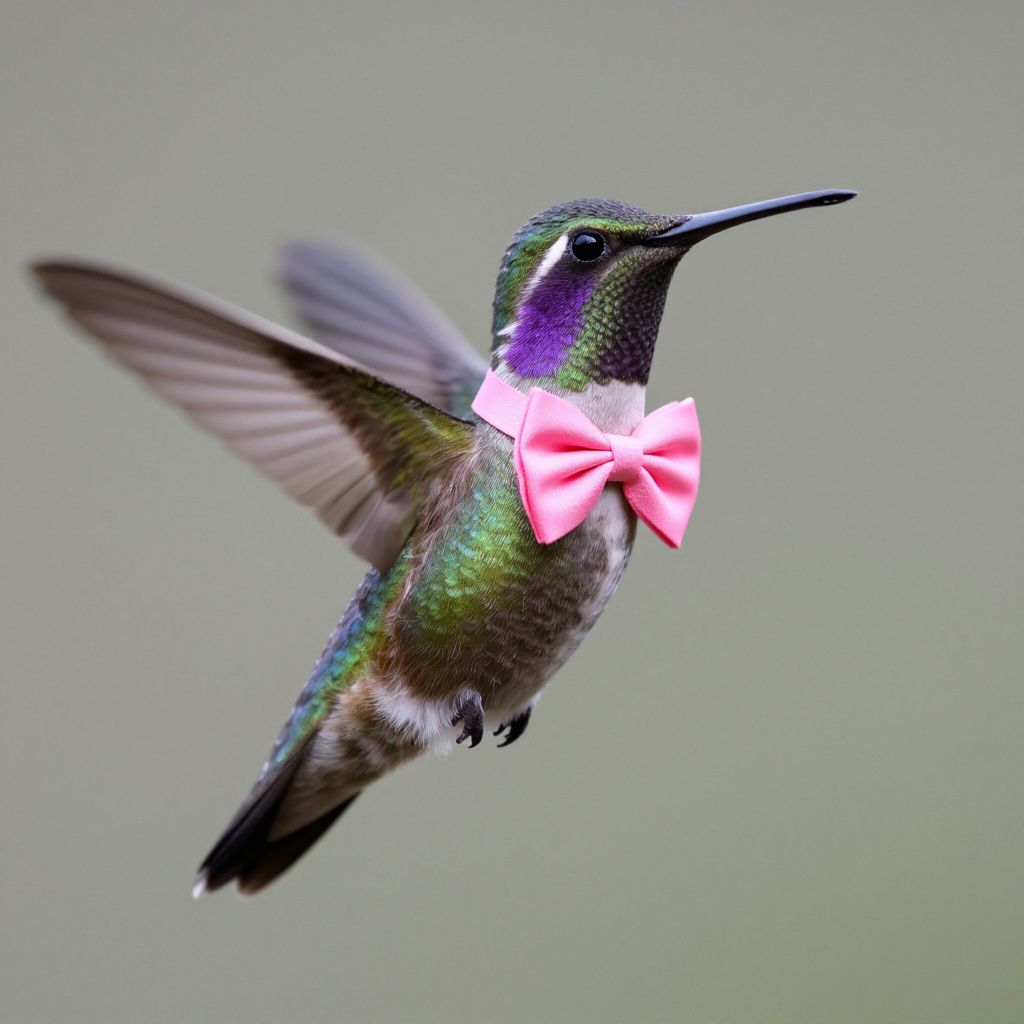 A vibrant hummingbird, adorned with a striking pink bow tie, stands gracefully against a softly blurred background. Its iridescent green and purple feathers glisten, adding a touch of elegance to its appearance. The bird's sharp, pointed beak and delicate wings are accentuated by the intricate details of its plumage. The bow tie, neatly tied around its neck, contrasts beautifully with the bird's natural colors, creating a whimsical and charming effect. The overall composition is balanced, with the hummingbird centrally positioned, drawing the viewer's attention to its detailed features and the subtle interplay of colors in its feathers.