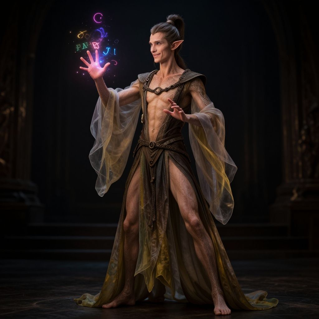 ((cinemtic shoot)) ((fantasy)), ((rpg)), ((focus on character)), photo of 1 man with Chin Strap and High ponytail hairsytle from akaviri, as Elven singer - pointy ears, fairy skin complexion, semi transparent long elven robes, (brown, yellow, green grey ) outfit, slim body, slender, long legs, slim face, big eyes, casting magic spells, intricated gests in the air, colorfull sings and letters glowing in the air, smile , perfect detailed face, intricated skin, realistic, ((photorealistic)) rim lights, dark shadows, cinematic scene, movie shoot, dark, zPDXL, defined muscles, extremely detailed, glass reflection, detailed hands, (realistic fingers:1.3), hard light hard shadows, vellus, subcutaneous veins, shallow depth of field, vignette, highly detailed, high budget Hollywood film, cinemascope, moody, epic, gorgeous, detailed background, ((darkfull )), detailed realistic toes SK_Fantasy