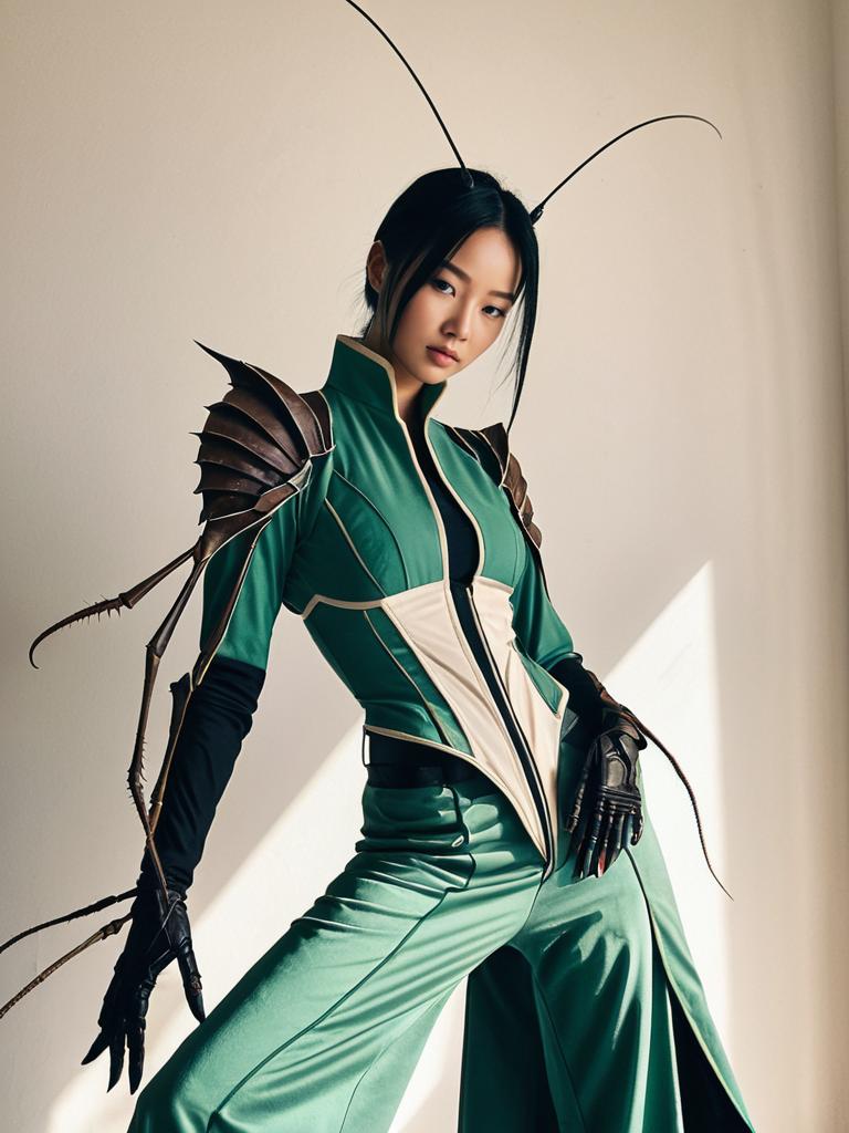 Woman cosplay. Wearing Togaru Kamakiri (Jack Mantis) costume. Realistic photo. Dressed as Togaru Kamakiri (Jack Mantis) --sref 1400