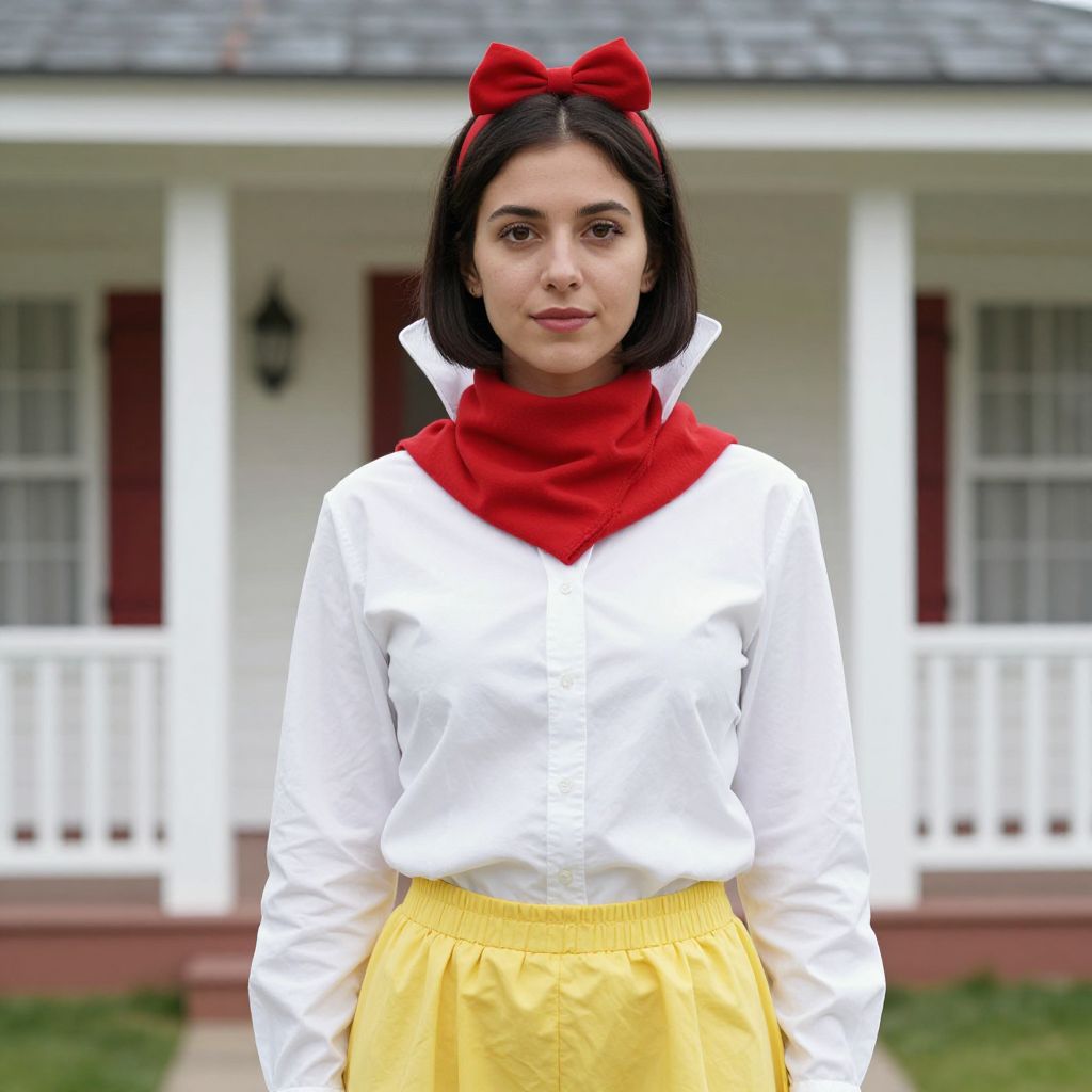 Snow White Shirt Costume, woman wearing a white shirt and a red scarf standing in front of a house