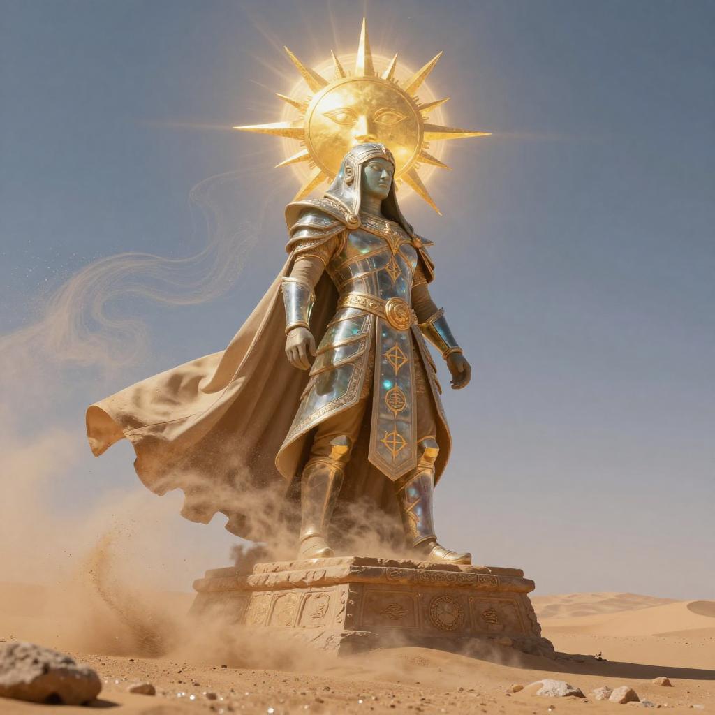 Solar-tempered sand warden 1 wind-sculpted cloak, glass-sand armor and sun-forged sigils perched in ancient sandstone pillar rising from a shimmering desert mirage, sun halos and drifting glass-sand eddies. Shot on Fujifilm GFX100 II 102MP with 80mm GF lens, hyperdetailed, 8K HDR, dramatic lighting, cinematic atmosphere.