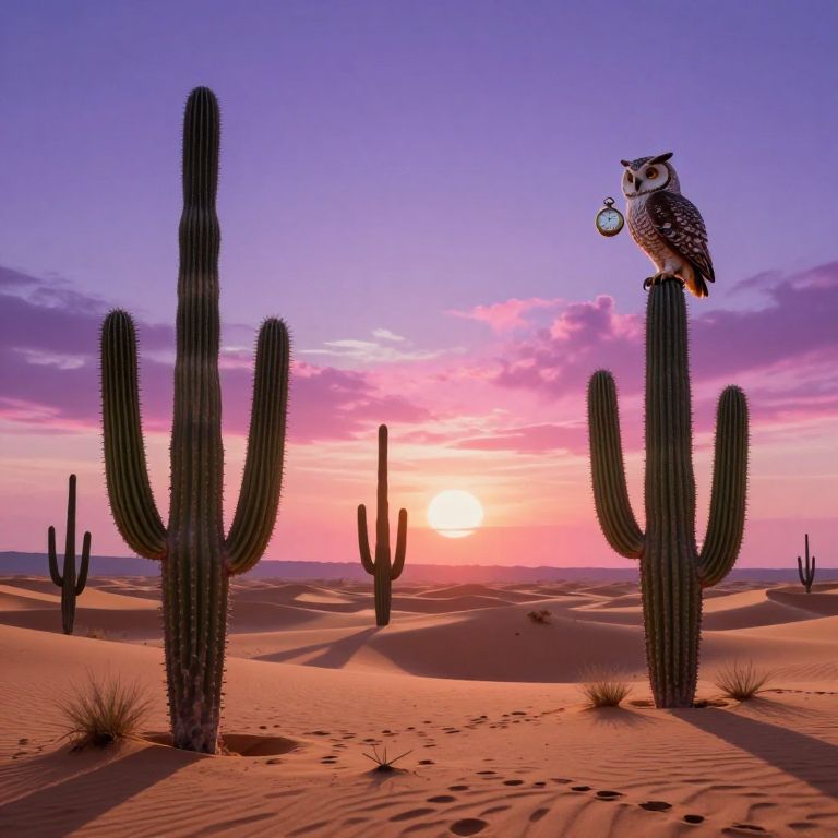 Envision a surrealistic desert panorama where colossal cacti loom over rolling sand dunes, their spiny silhouettes echoing the melting timepieces of Dali-esque visions. Perched atop one of these towering plants sits an avian figure, an anthropomorphic owl gazing pensively at the distant horizon while clutching a pocket watch in its claws. As the sun descends, the sky ignites with swirling shades of purple and pink, casting elongated shadows across the landscape and enveloping everything in an otherworldly radiance that conveys both serenity and enigma. The image should be captured in high-definition clarity, accentuating the surreal fusion of elements while preserving a dreamlike ambiance that enthralls the viewer's imagination.