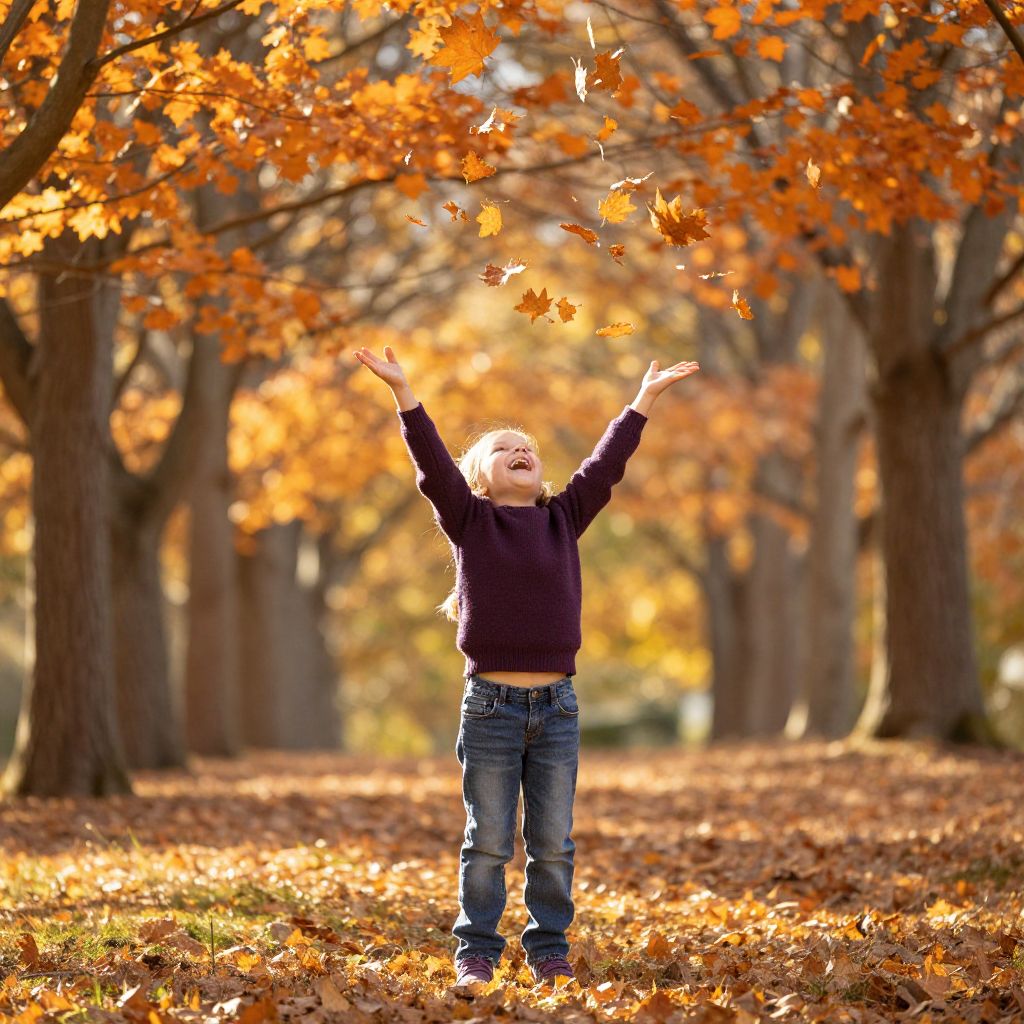 Child joyfully raises arms amidst a cascade of vibrant orange maple leaves floating through the air, capturing the essence of autumn's exuberance in a sunlit forest clearing.