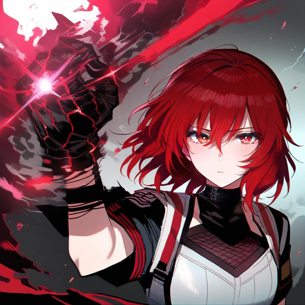 Illustration of an anime-style young woman with short red hair and brown eyes, dressed in a futuristic black and white outfit with red accents. She is shown with a serious expression, raising her gloved hand emitting a powerful red energy blast against a dynamic background.