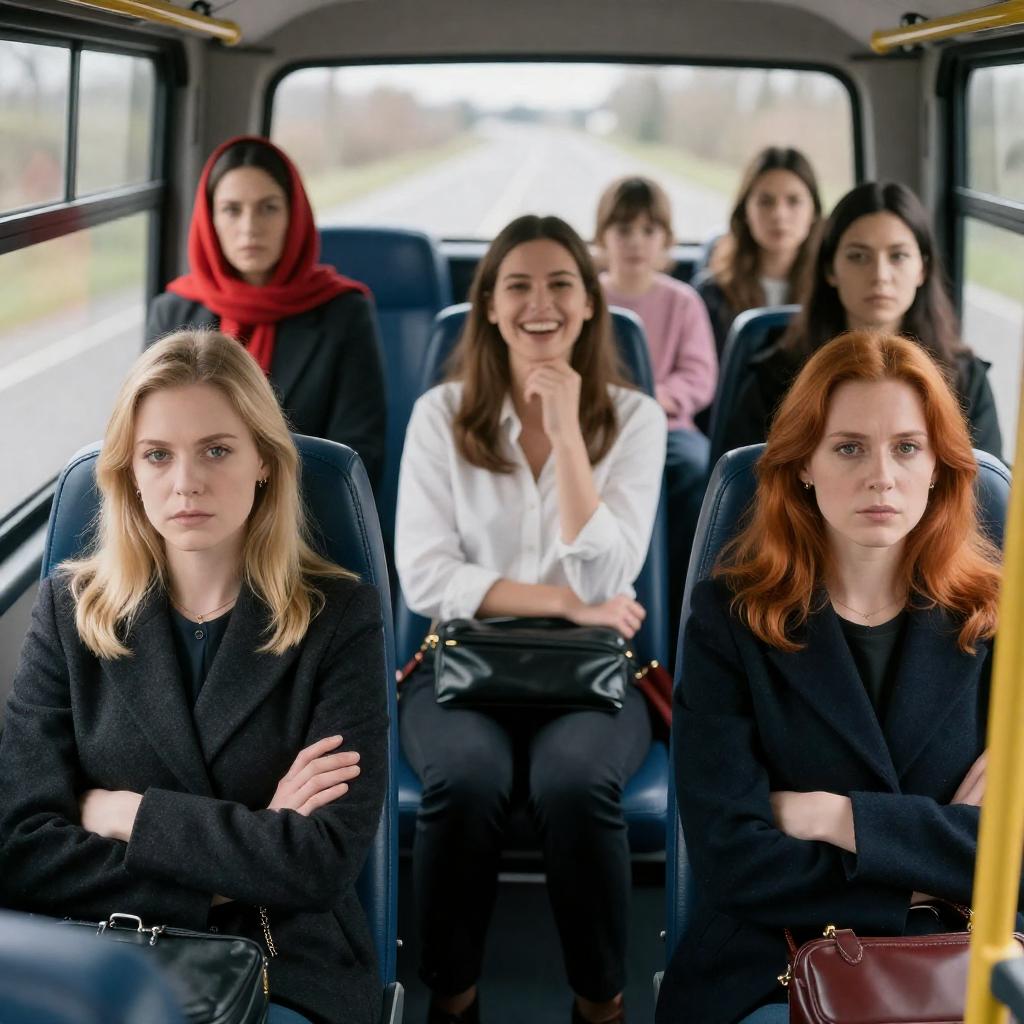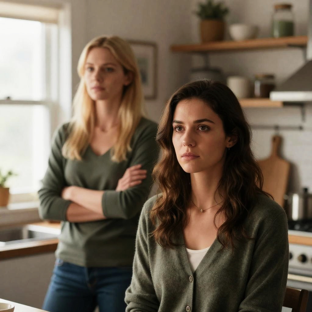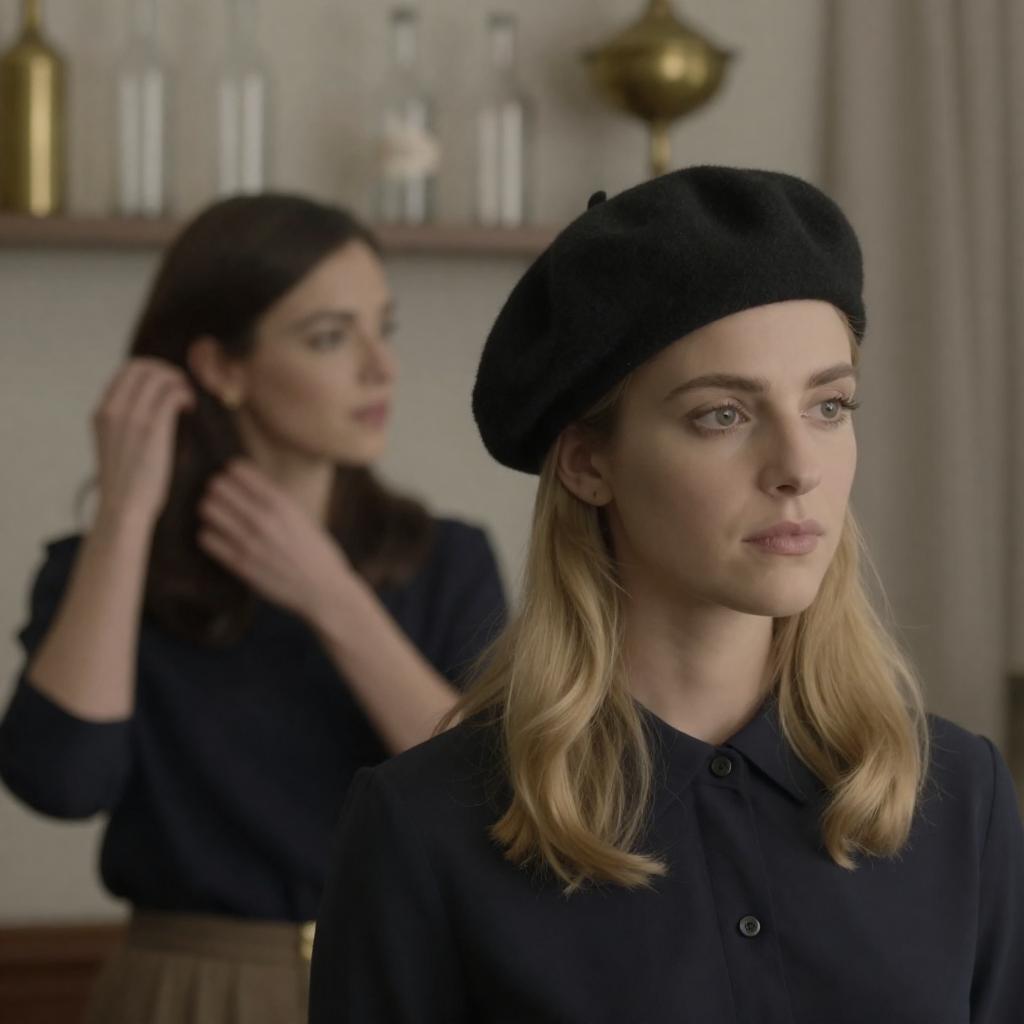 Photograph of a restaurant interior. Two women, one in foreground, one in background. Foreground woman, blonde, black beret, black cardigan, green blouse, hands on table, glass of wine, intense gaze. Background woman, dark brown hair, navy dress, seated, serious expression. Wooden tables, chairs, glass bottles on shelves, white curtains, large window, muted lighting.