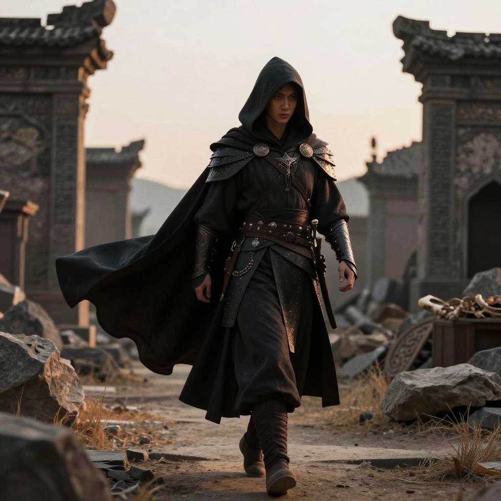 A dark hooded cape flowing in the wind as a lone warrior walks through an ancient ruined city at dusk, subtle glint of armor beneath, cinematic lighting, high detail