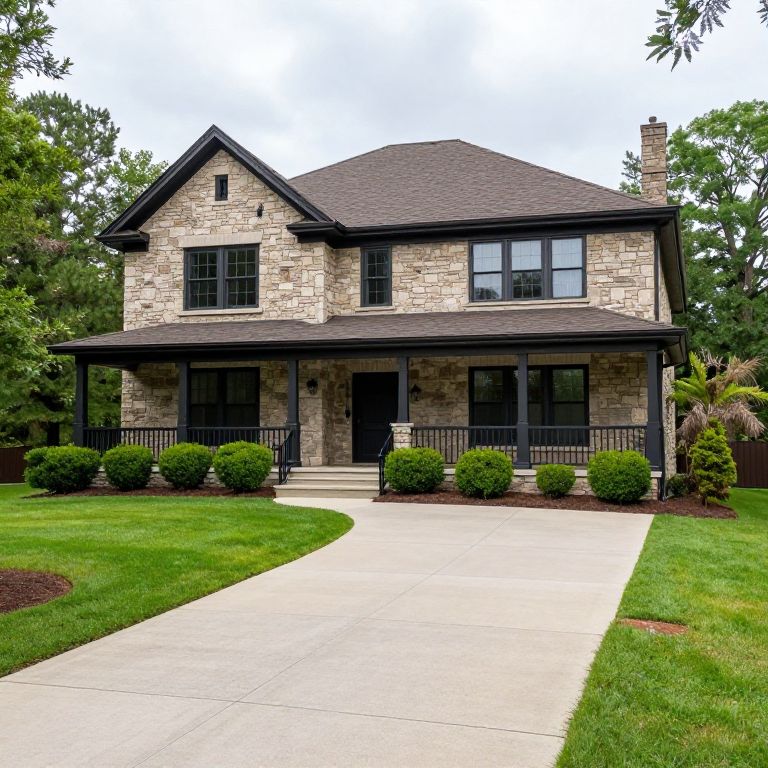 Imposing two-story stone mansion in Duluth, GA, featuring a dark brown roof, prominent front porch with black railing, and lush landscaping including manicured shrubs and vibrant green lawn surrounding a wide concrete driveway.