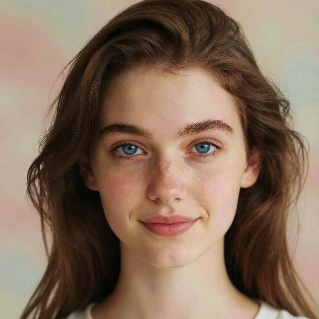 A portrait of a young woman with brown hair and striking blue eyes, soft natural lighting, detailed skin texture, subtle freckles, gentle smile, slightly tousled hair, dreamy background with pastel colors, hyper-realistic style