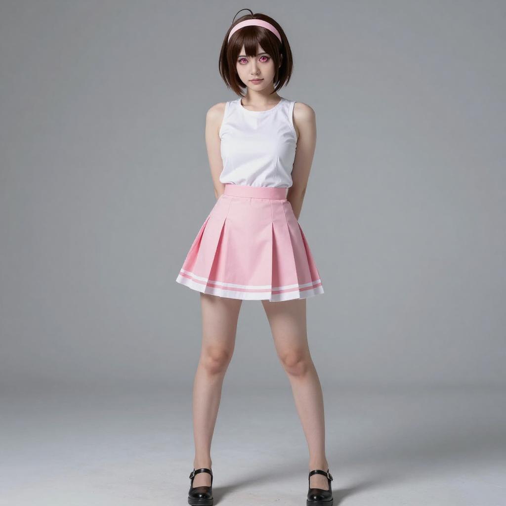 Photograph of a young woman standing against a plain grey background. She has a pale skin tone, short dark brown bob haircut with bangs, and wears a pink headband. She is dressed in a sleeveless white top and a pink, high-waisted, pleated mini-skirt that flares out. She stands with her hands behind her back, legs slightly apart, and wears black Mary Jane shoes with ankle straps. Her expression is neutral, and the lighting is even, highlighting her outfit and figure. The background is simple and unobtrusive, focusing attention on her.