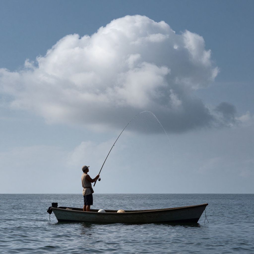 Fisherman stands alone in a small wooden boat, casting a long fishing rod upward toward a massive cloud above, as delicate threads of crystallized rain connect the heavens to the serene ocean below.