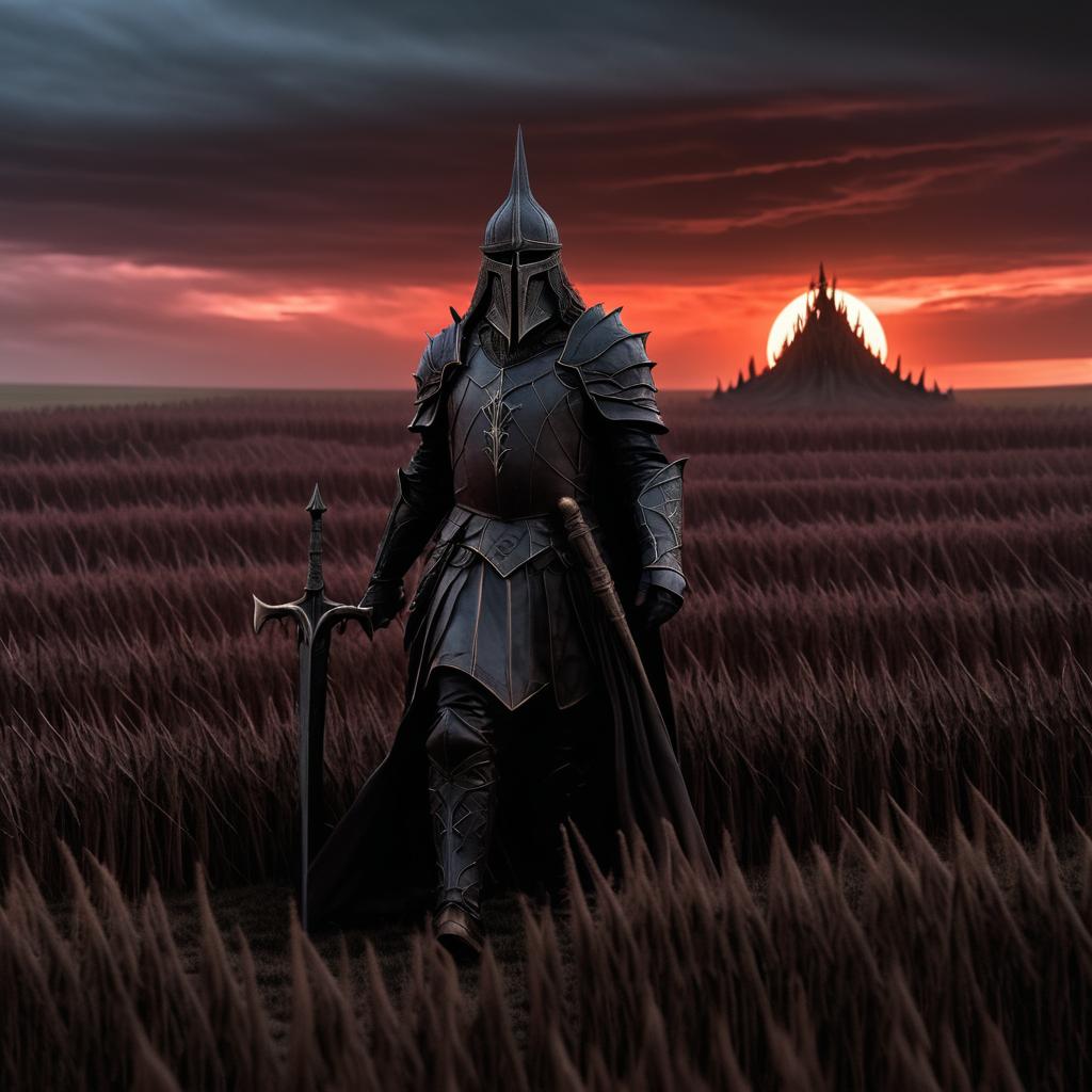 Chocolate Peanut Butter a highly detailed photo from a fantasy film + the witch king of angmar walks through a field of barrow mounds, the sky is dark and gloomy with red clouds, the camera focuses on the creature, ultra-detailed, ultra-realistic, cinematic, 8k, volumetric lighting,