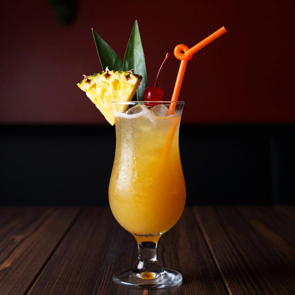 A vibrant photograph of a colorful cocktail in a clear glass with a wide base. The drink is topped with a slice of pineapple, a green leaf, a red cherry, and two orange straws. The background is a dramatic, blurred mix of red and black, making the drink's bright colors pop. The glass is frosty, and the drink has a slightly fizzy texture.