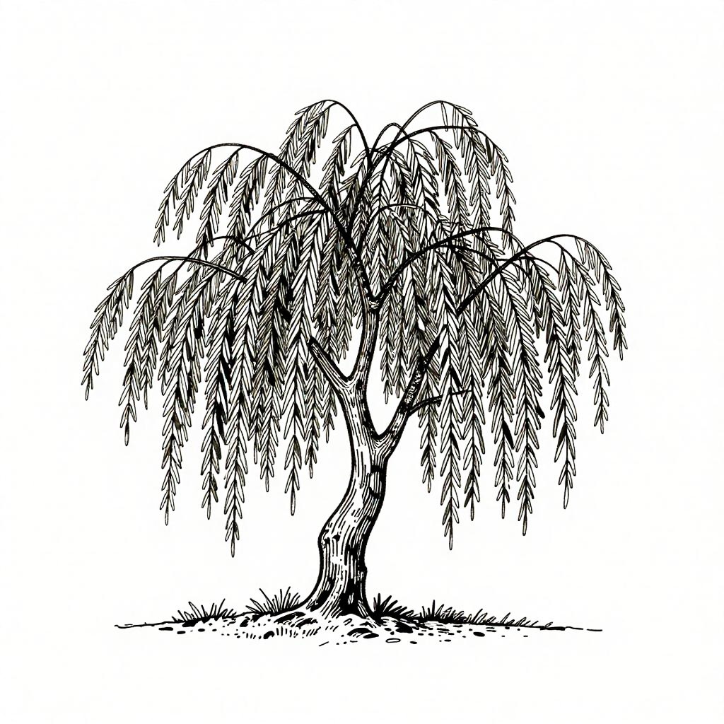 Landscape painting of a hand-drawn illustration of a willow tree, in a minimalistic style with monochrome patterns, intricate details on a white background, high quality.