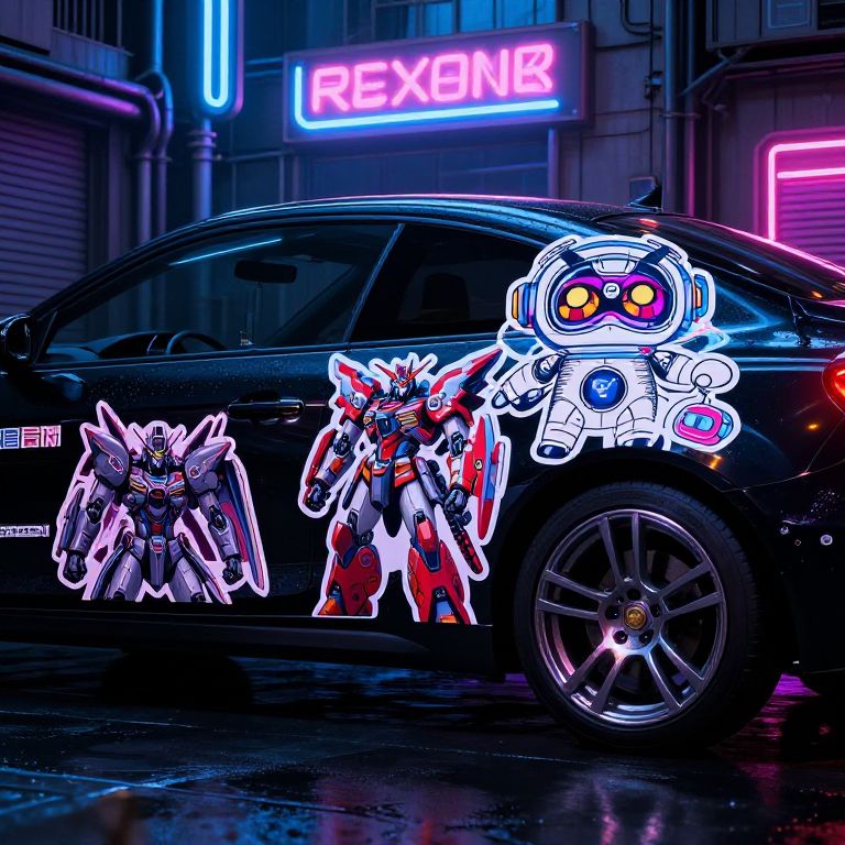 Futuristic anime sticker car parked in a cyberpunk alley, stickers displaying bold anime mecha designs and cute robot mascots, neon signs overhead illuminating the glossy black car, reflective wet pavement, high detail and atmospheric lighting