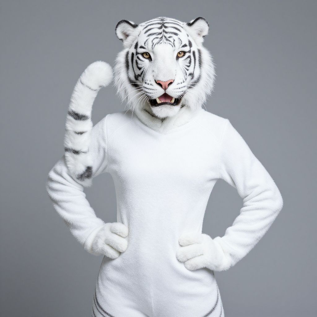 Photograph of a white anthropomorphic tiger in a white shirt, standing with one hand on hip and the other raised, against a gray background. Tiger