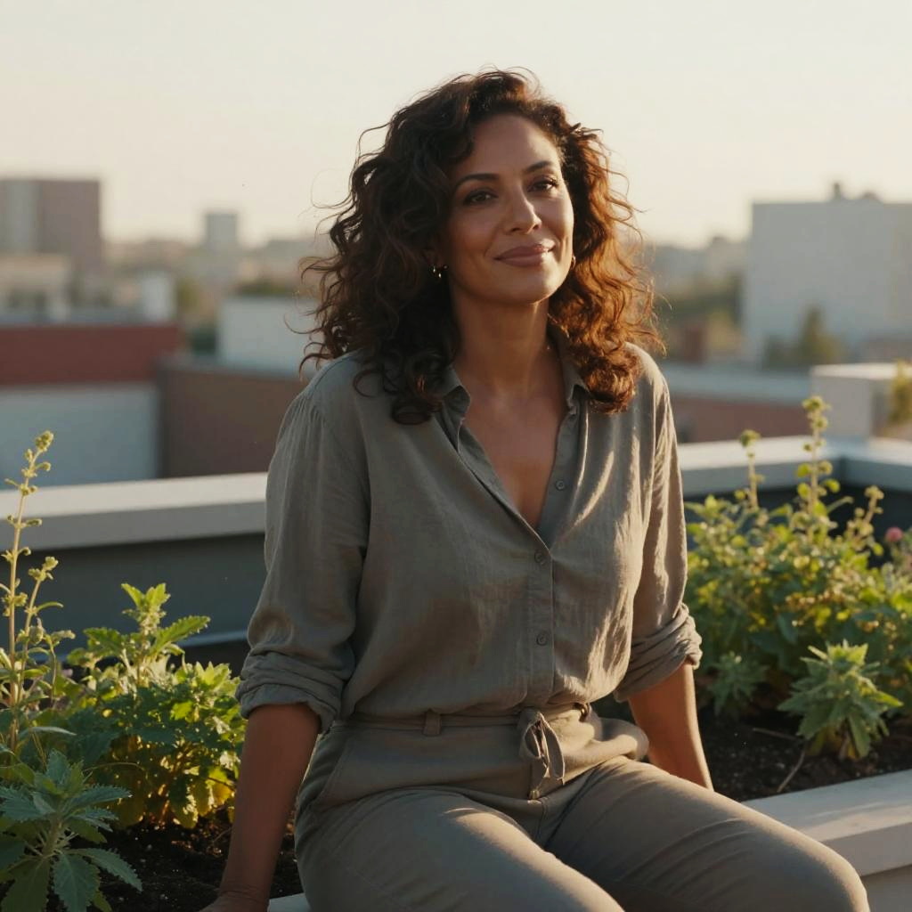(masterpiece:1.1), best quality, (photorealistic:1.2), hyperrealistic, award-winning portrait of woman in early 40s, deep brown curly hair, gentle smile, upper body, expressive eyes, slim wai BREAK 1.1, wide hips:1.1, athletic-curvy build, wind-swept hair, sitting in urban rooftop herb garden in the morning, wearing casual blouse and relaxed pants, golden hour glow, dappled light, soft particles in the air, 8k, highly detailed, broad lighting, chromatic aberration, subtle film grain, ray tracing, octane render, soft bloom