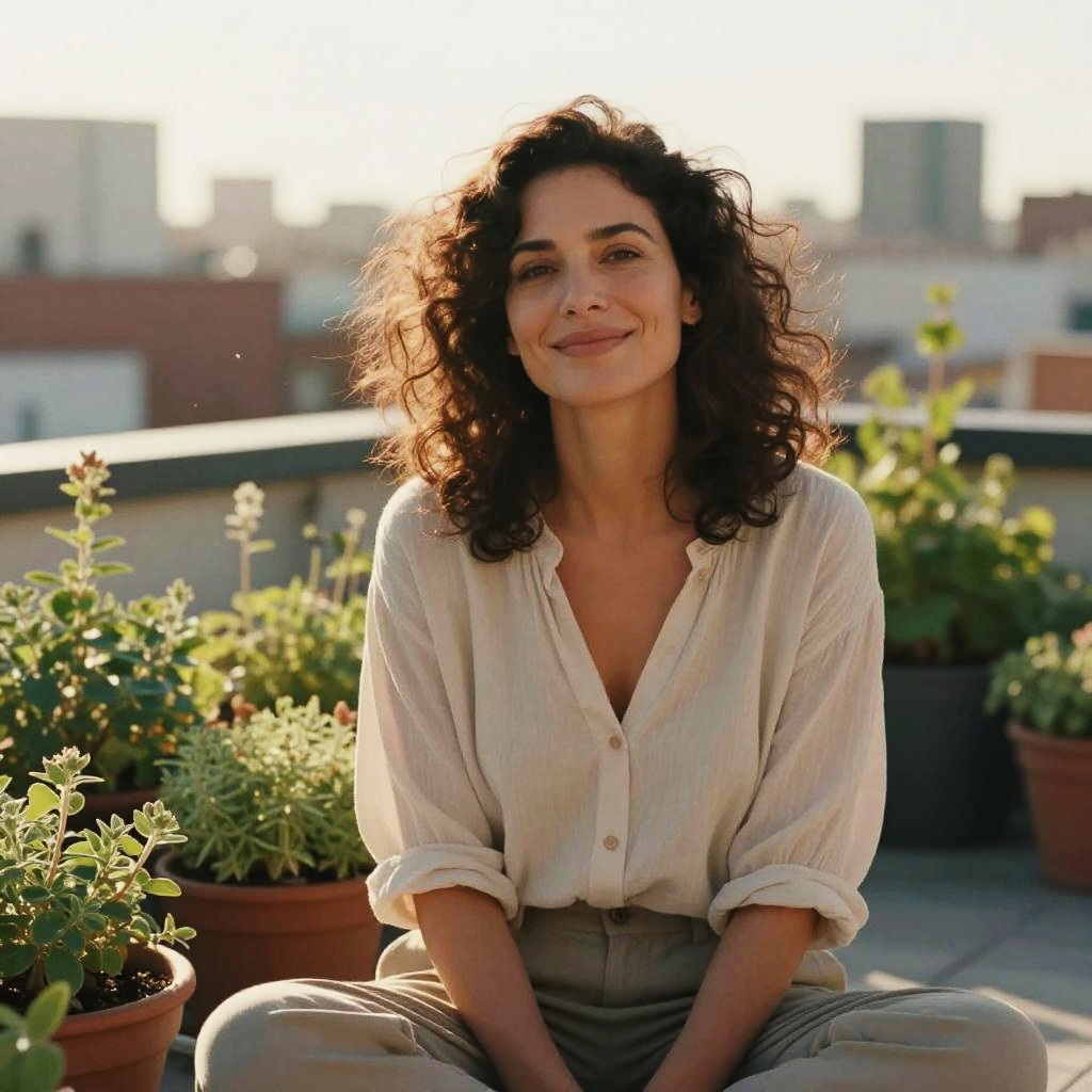 Photograph of a smiling woman with wavy, dark brown hair, wearing a white, slightly sheer, button-up shirt with rolled-up sleeves and beige pants. She sits cross-legged on a rooftop terrace, surrounded by potted plants with green foliage and small red flowers. The background features a blurred cityscape with buildings bathed in warm sunlight. Her light olive skin contrasts with her dark hair, and she exudes a relaxed, natural charm. The image has a soft, warm glow, highlighting her serene expression and casual, yet stylish, appearance.