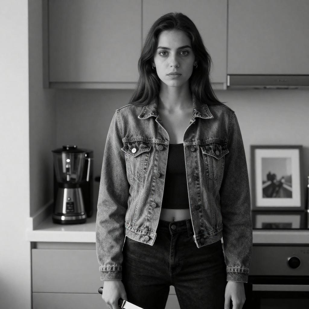 Black-and-white photograph of a young woman with long, straight dark hair, wearing a denim jacket and dark pants, standing in a modern kitchen. She holds a knife in her right hand, looking serious. Kitchen background includes a coffee maker, blender, and framed picture. High contrast lighting emphasizes her focused expression.