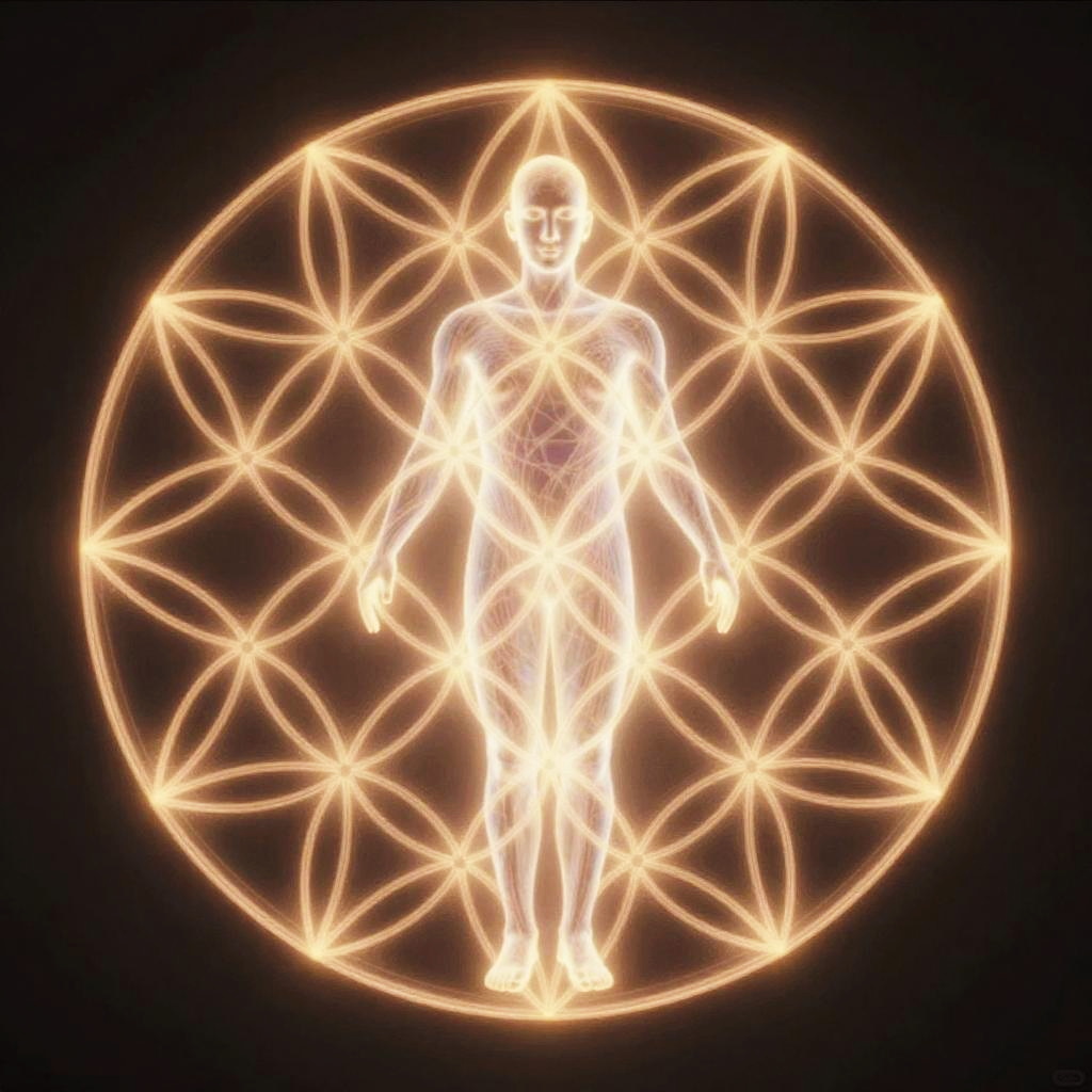 Realistic photo.the flower of life glowing as a pyramid around the human form, ethereal lighting, intricate line work, spiritual theme realistic photo