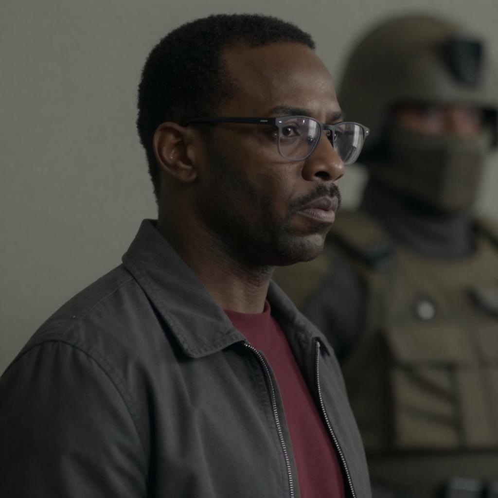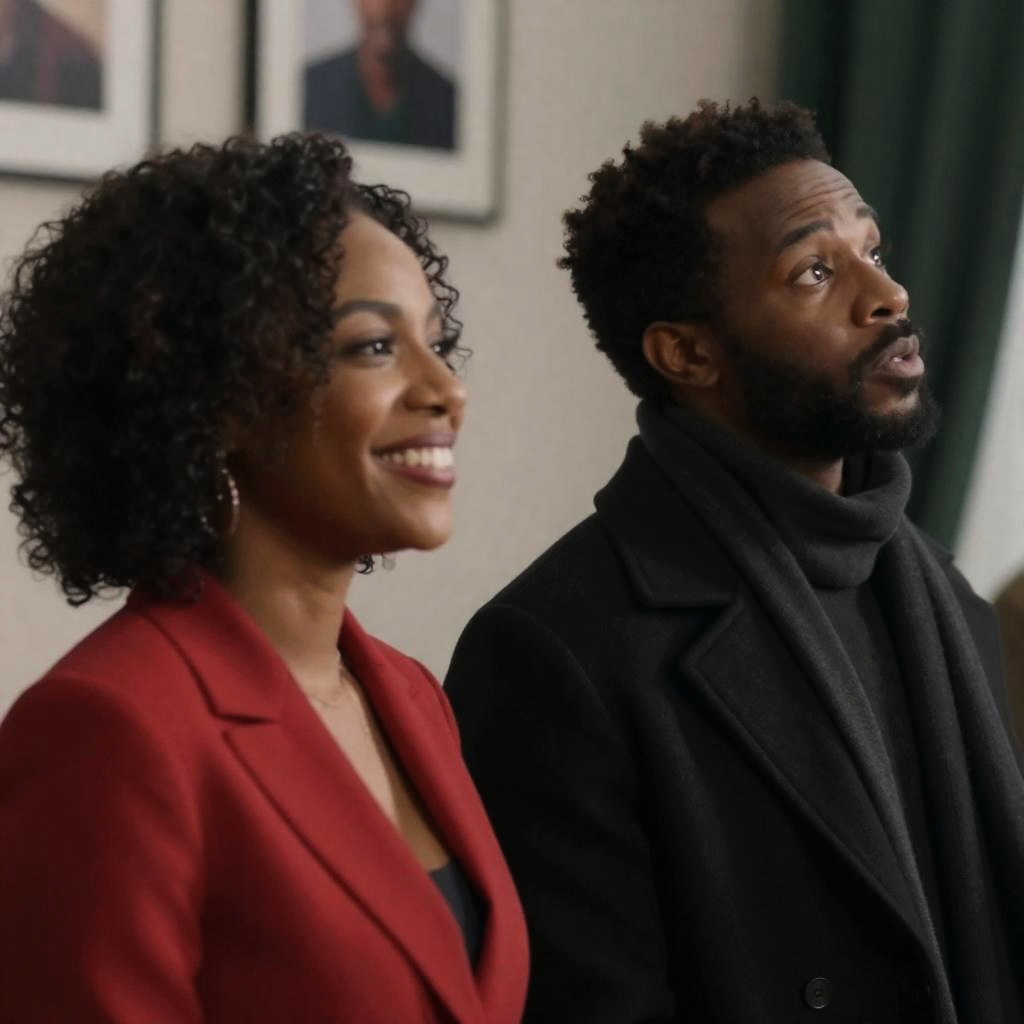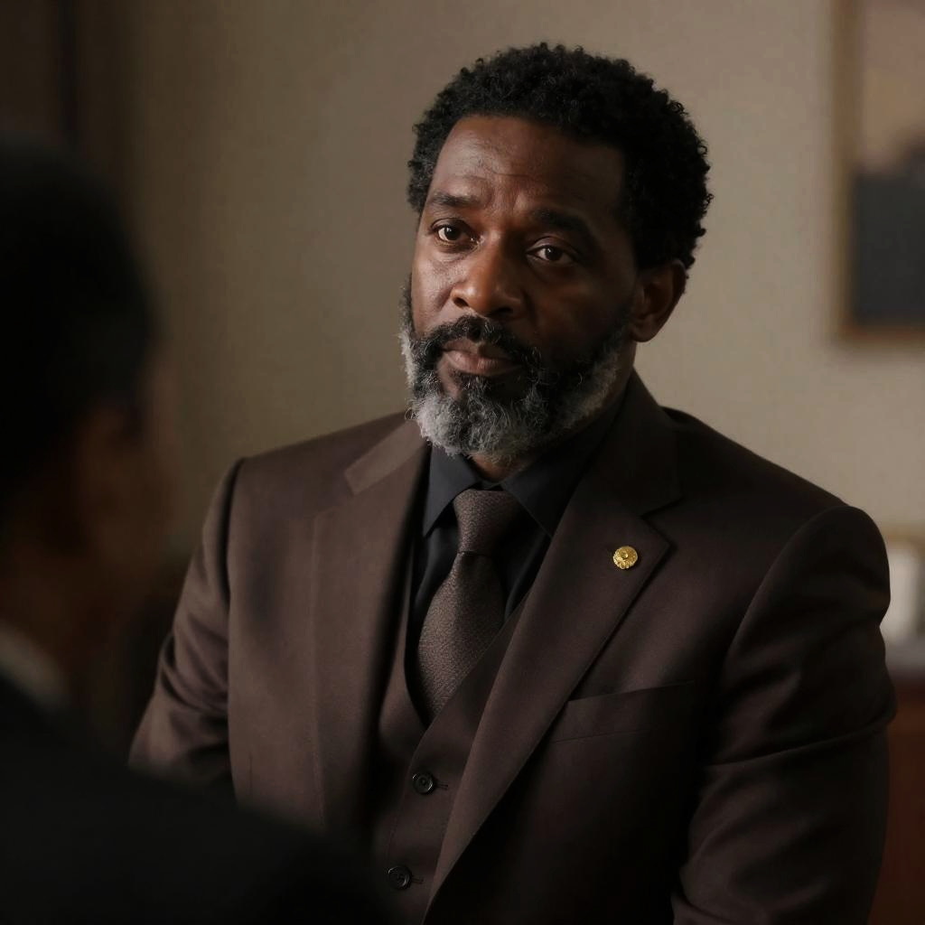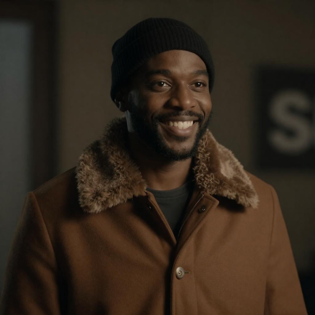 Photograph of a smiling man with dark skin, short beard, and black knit cap, wearing a brown woolen coat with a fur collar, illuminated by warm, low light. Background is dark and blurred. Right side has and s. Man's face is turned slightly to the left.