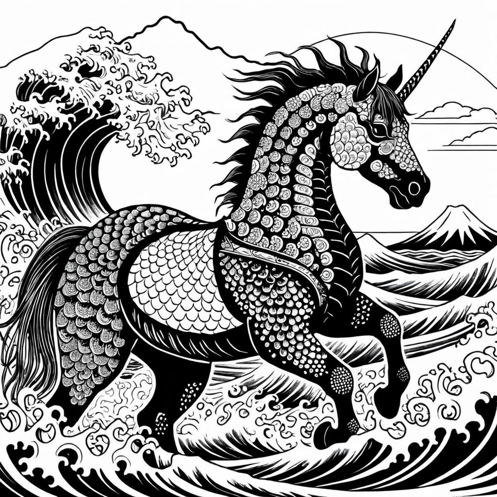 Ukiyo-e Style Seahorse Coloring Page