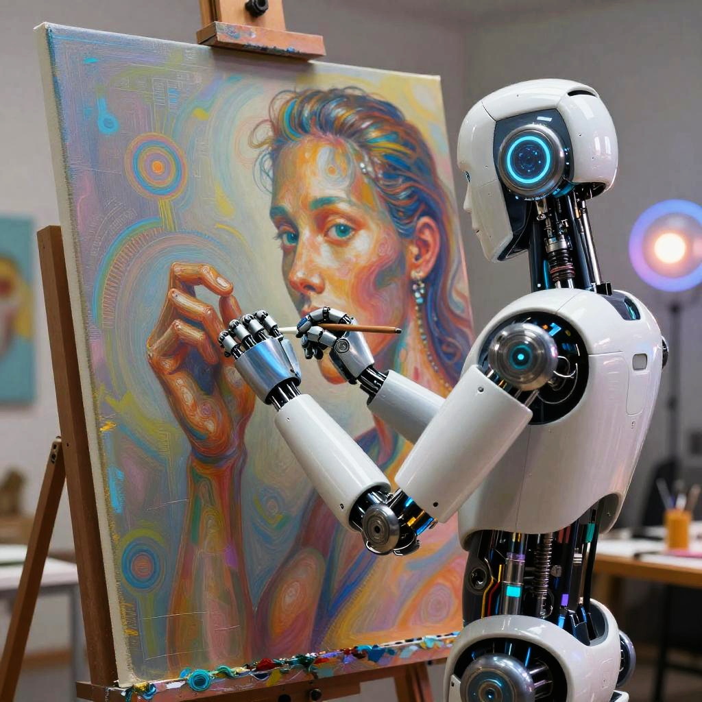 AI image generator human scene showing a humanoid robot painting a mesmerizing portrait on a canvas, blending organic human textures with synthetic materials, surrounded by soft glowing lights and abstract technology patterns, ultra-detailed and colorful.