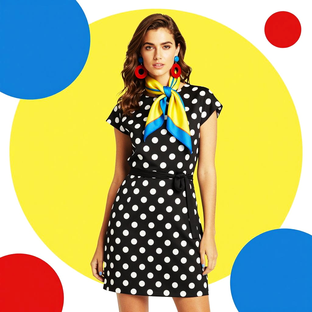 Portrait of a young woman wearing a black and white polka-dot dress with a waist tie, accessorized with bold red and blue earrings and a yellow and blue silk scarf. She poses against a vibrant pop-art style background featuring large colorful circles in red, blue, and yellow. The image showcases modern fashion with a playful and artistic aesthetic.