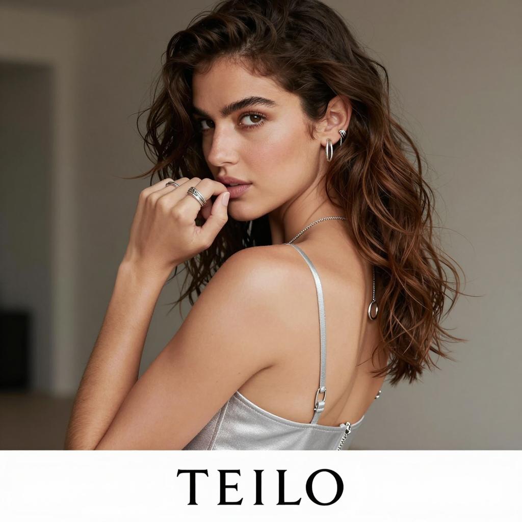 Portrait of a light-skinned woman with wavy brown hair wearing a silver backless dress with thin straps. She has an intense side gaze, accessorized with silver earrings, multiple rings, and a silver necklace with a circular pendant. The background is softly blurred. The brand name 'TEILO' is displayed at the bottom.