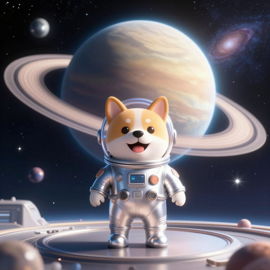 Cute digital illustration of a Shiba Inu in a silver spacesuit standing on a space station, with a large planet and rings in a star