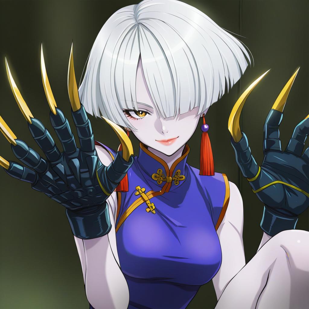 A.k.i. (street fighter), street fighter, 1girl, pale skin, red lips, mole under mouth, red eyes, hair over one eye, short hair, white hair, grey hair, china dress, chinese clothes, tassel earrings, claw (weapon), claw ring, by artist haruyama kazunori, illustrious