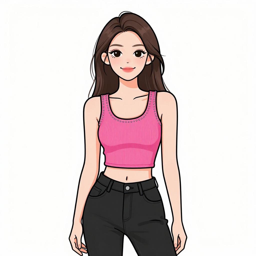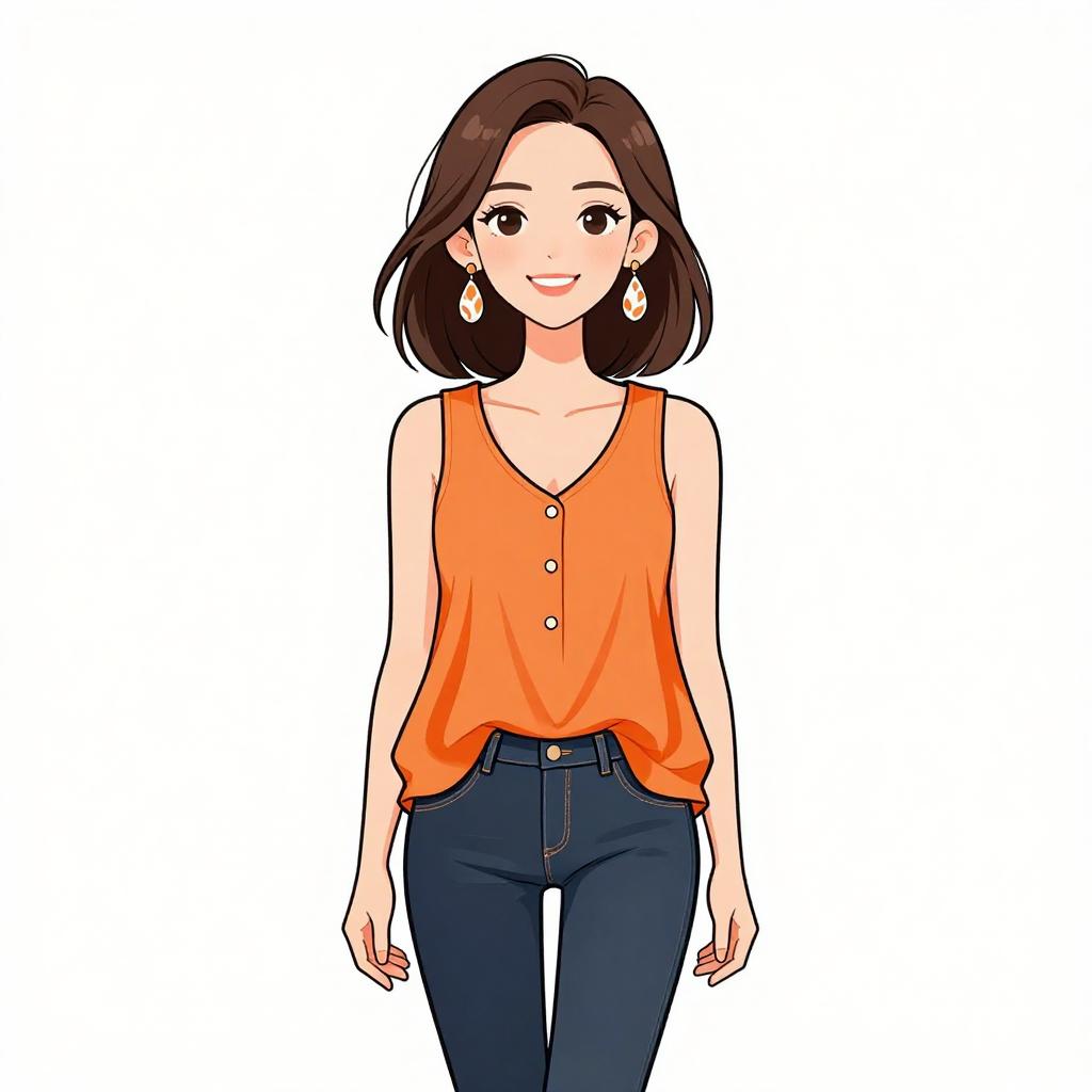 Woman with pretty face and pretty hair. smiling Woman, casual, maroon sleeveless top with scoop neckline, lace detailing on the shoulders, flowing fabric, navy blue skinny jeans. --sref 1467