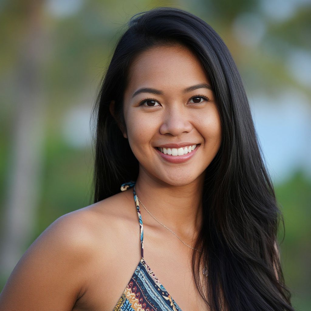 Photograph of a smiling Asian woman with long, straight black hair. She has medium-dark skin, almond-shaped brown eyes, and full lips. She's wearing a patterned halter top and a delicate necklace. The background is blurred with green and blue hues, suggesting an outdoor, possibly tropical setting. Her confident smile and relaxed pose give a warm, friendly vibe.