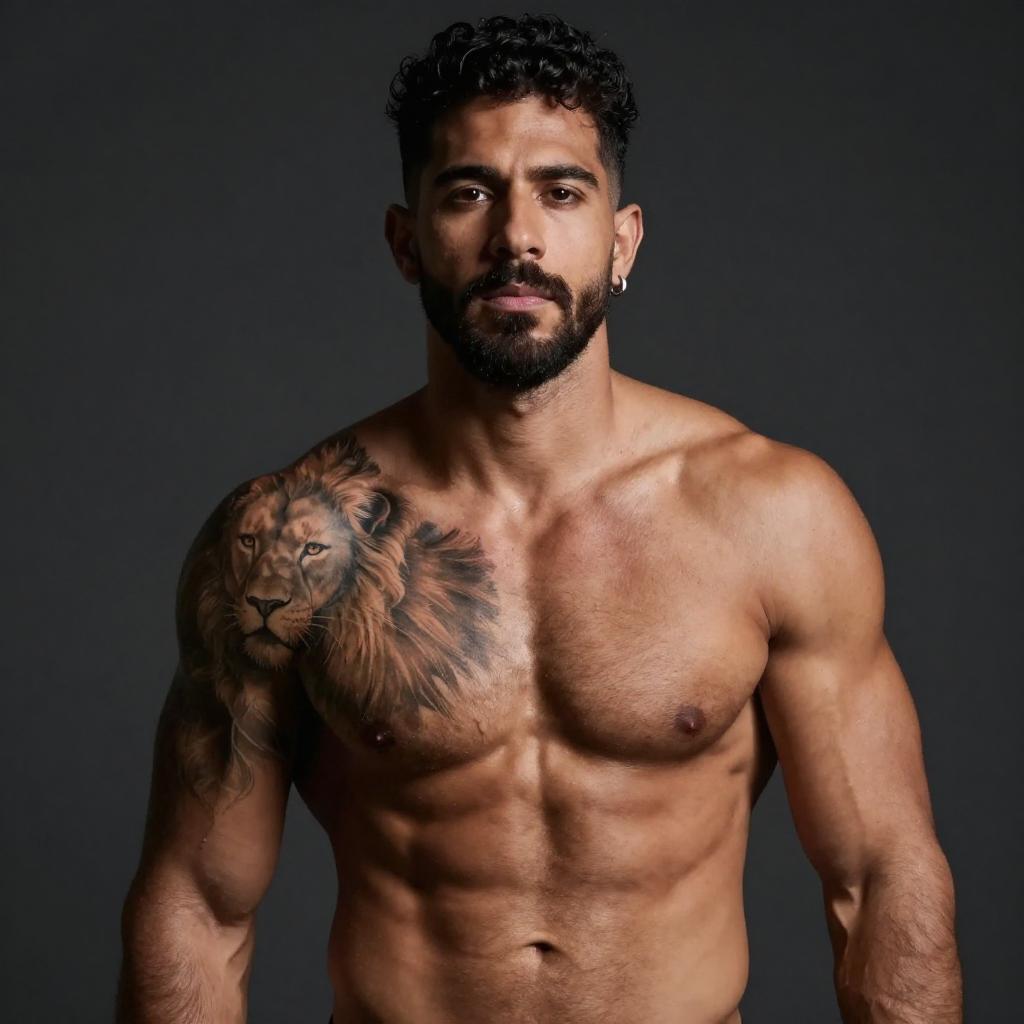 Photograph of a shirtless, muscular man with a dark, trimmed beard and short, curly black hair. He has a large, detailed tattoo of a lion's head on his right pectoral muscle. His skin is tan, and he wears a small hoop earring in his left ear. The background is a solid, dark gray, making him the focal point. The lighting highlights his defined abs and chest muscles.