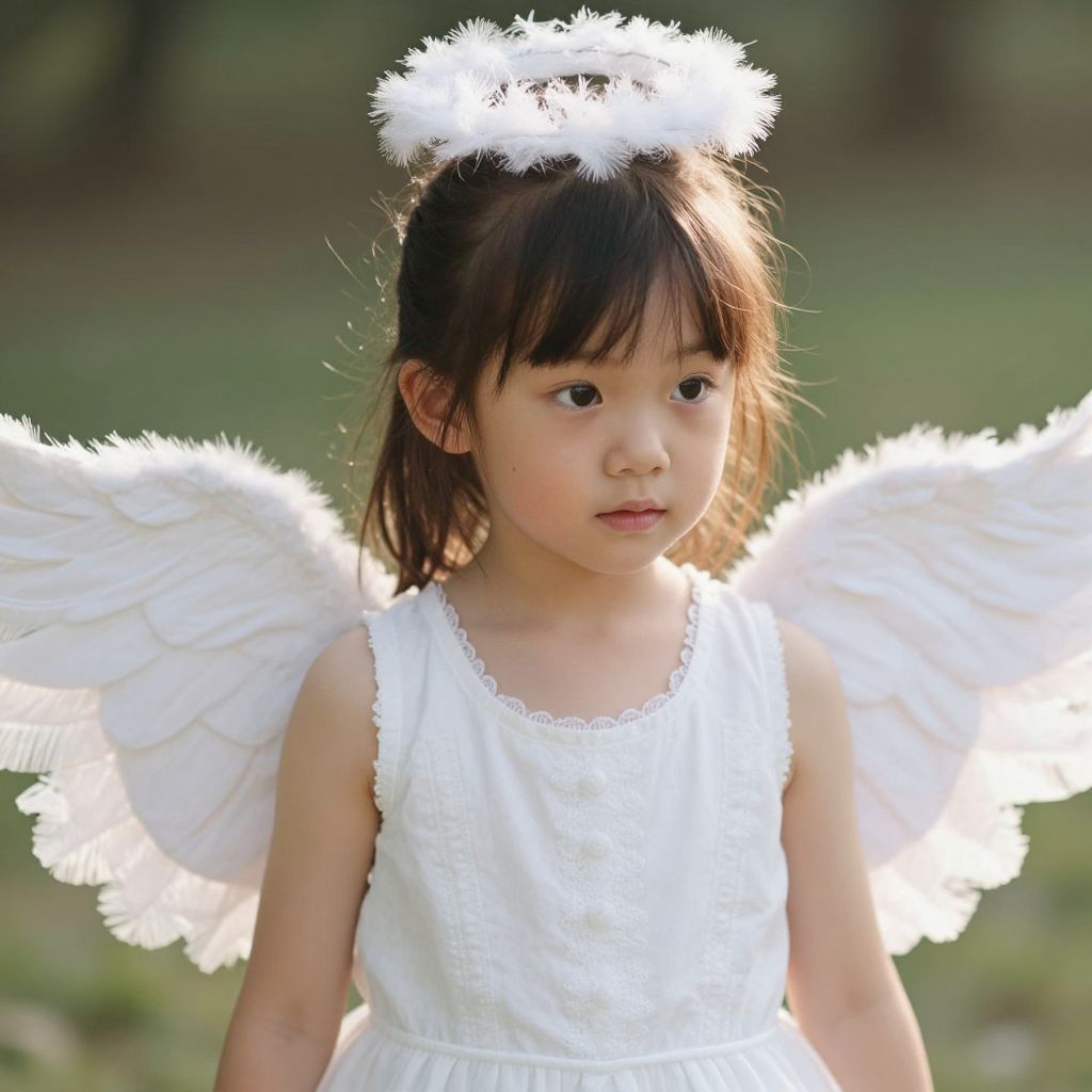 Light Angel Costume Girl, a close up of a child dressed in a white angel costume