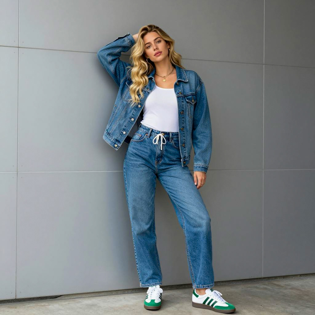 Photograph of a blonde woman with light skin, wearing a fluffy red jacket, white crop top, high-waisted white denim skirt, and sunglasses. She has her arms raised, a small red chain purse on her left side. Background: clear blue sky with white clouds and a white wall. Sunlight casts shadows.
