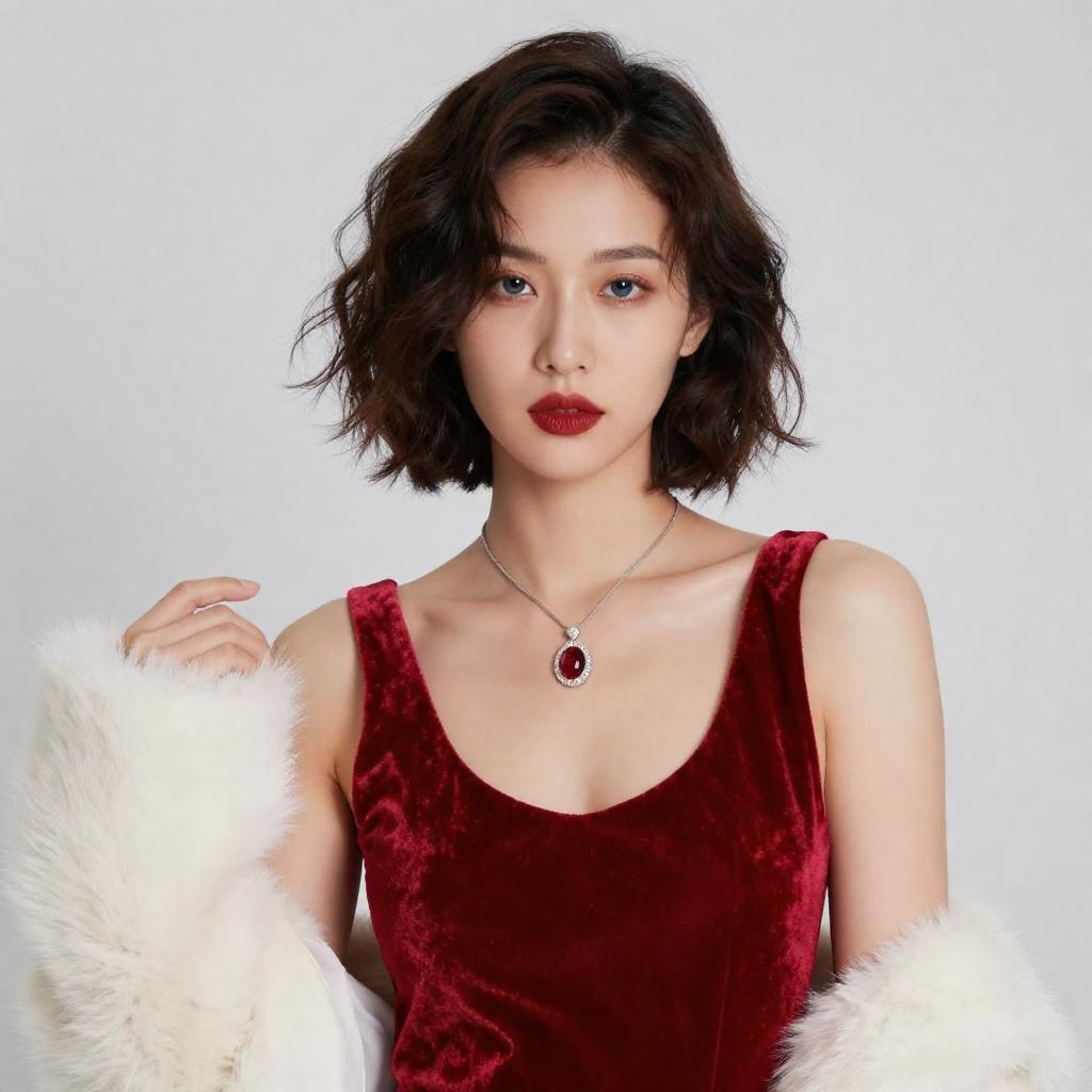 Photograph of a woman with short, wavy dark brown hair, wearing a red velvet sleeveless dress with a low neckline, and a silver necklace with a red gemstone pendant. She has red lipstick, blue eyes, and a neutral expression. She holds a white, furry ure object in her right hand. White background.