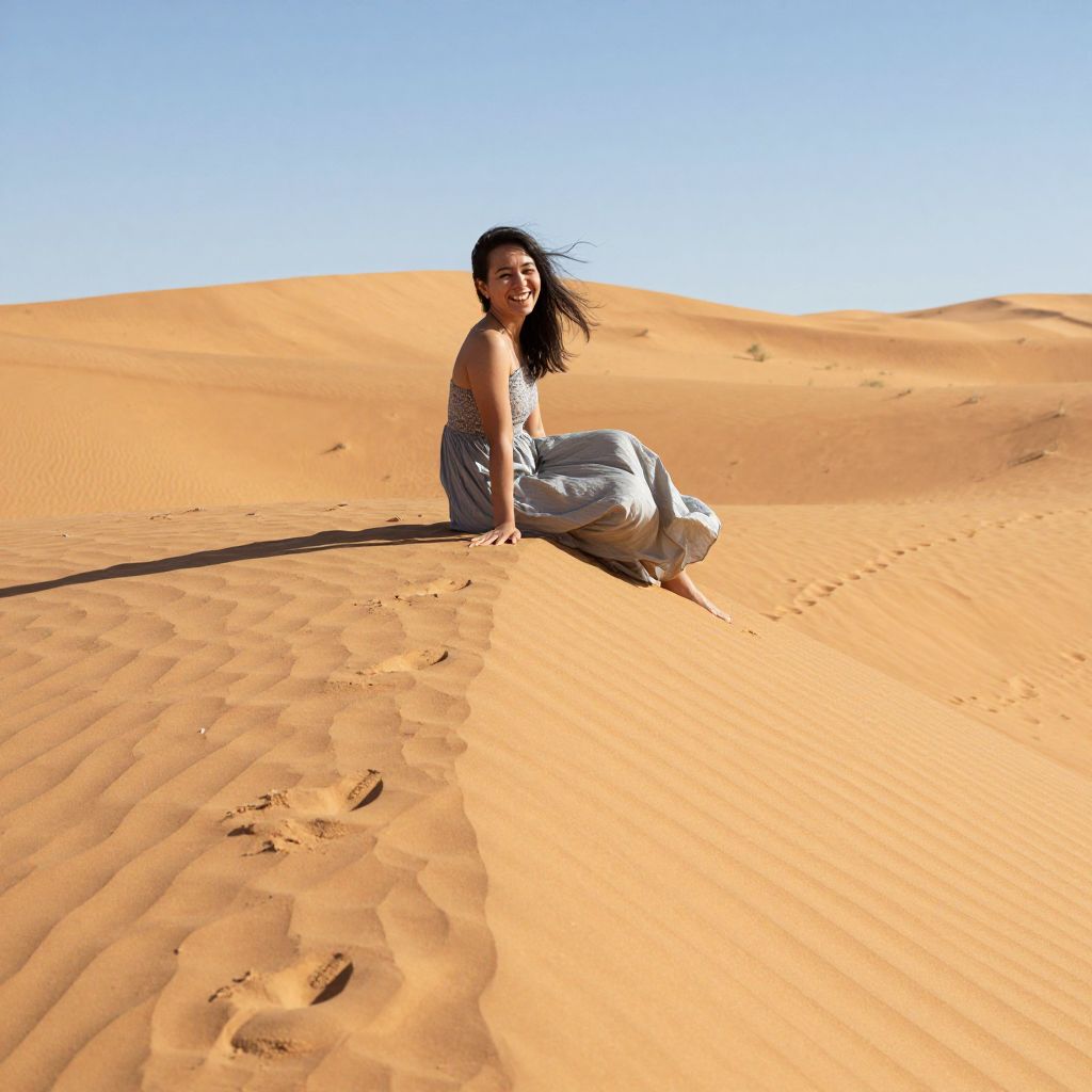 Photograph of a woman with long black hair in a white, flowing, sleeveless gown standing in a sunlit, sandy desert.