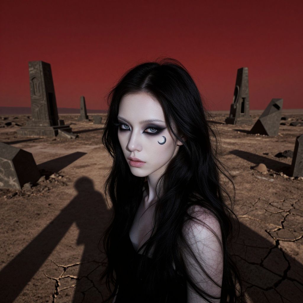 Craft an enigmatic hyperrealistic digital art piece reminiscent of surreal landscapes, depicting a haunting scene where a mysterious young woman with porcelain skin and long, dark hair poses in a barren wasteland under a blood-red sky. She sports sharp, angular features, deep-set eyes lined with smoky shadow, and a subtle crescent moon tattoo on her cheekbone. From an unusual 'bug's-eye view' perspective, the scene evokes a sense of otherworldly intrigue as the woman's delicate silhouette is accentuated by stark, geometric shapes that rise from the desolate landscape like ancient ruins, casting long shadows across the cracked earth and suggesting both beauty and danger in this surreal dreamscape.