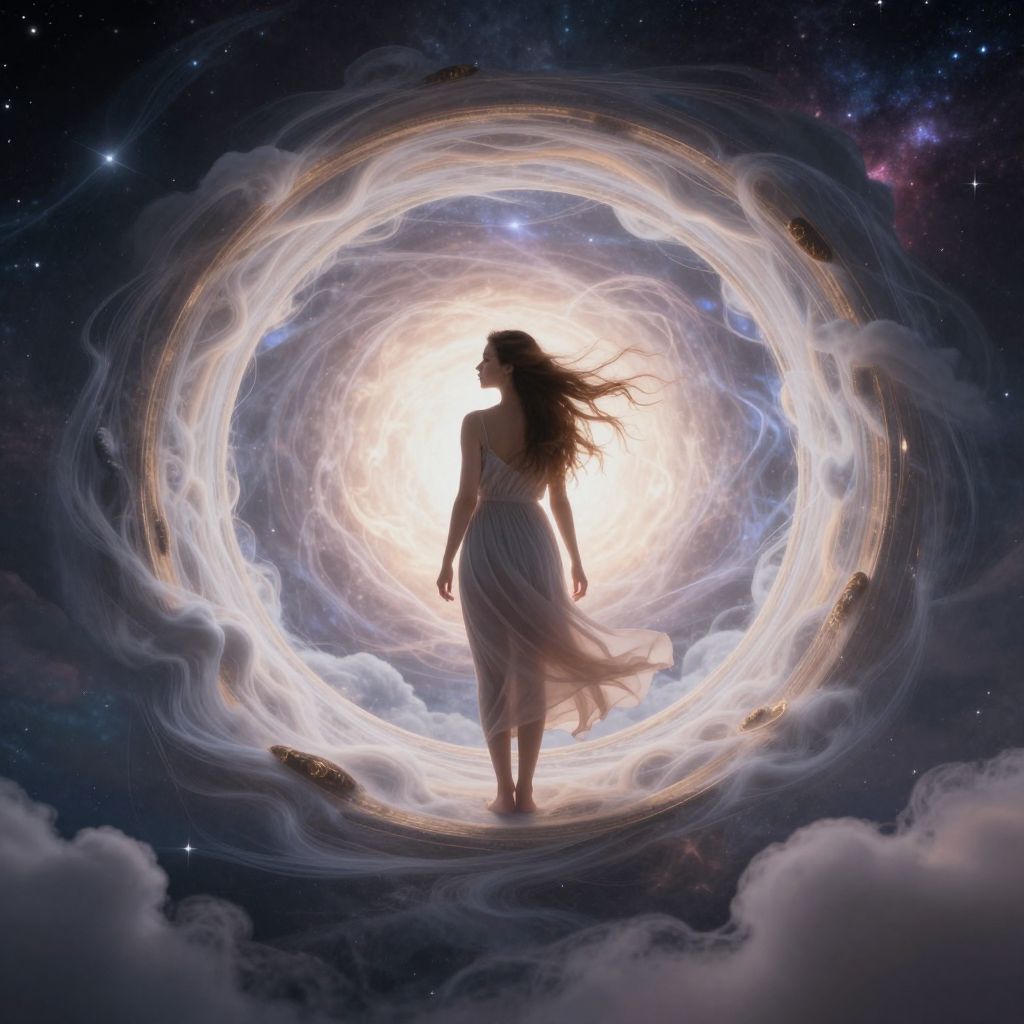 A woman with flowing hair stands in a circular portal, surrounded by swirling clouds and a cosmic background, symbolizing a journey into expanded consciousness.