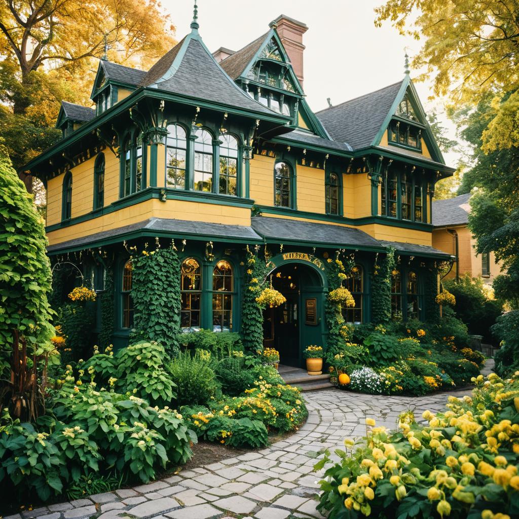 A charming Victorian-style brewery with intricate architectural details, surrounded by a mix of lush summer flora, the front yard adorned with clusters of hops flowers and sunlit ivy, a winding stone pathway leading to the entrance, evokes a warm, cozy fall atmosphere with vibrant emerald and golden yellow hues